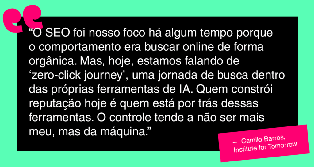Por falar em tech, Camilo trouxe uma previsão importante: em 2027 vamos começar a ultrapassar essa fronteira da busca generativa. Aí, entraremos no “agentic commerce”