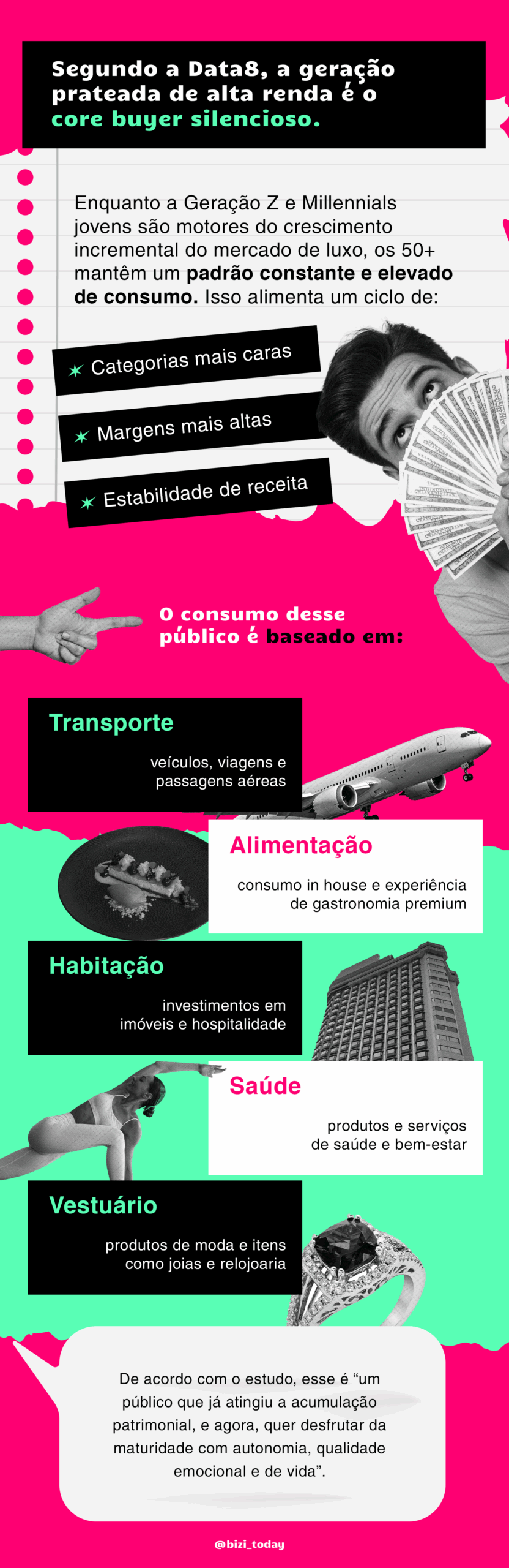 Essa geração representa 78% do público de alto poder aquisitivo no Brasil: são US$ 860 bilhões em ativos líquidos, com uma projeção de chegar a US$ 1 trilhão até 2030. Esse potencial é chamado de “silver money”.